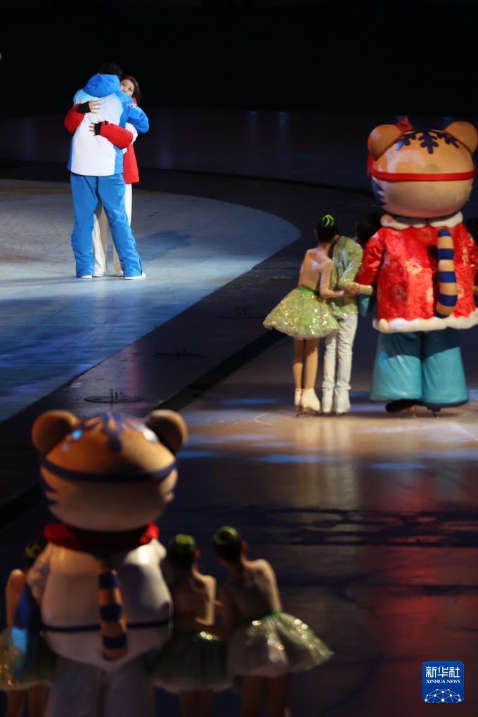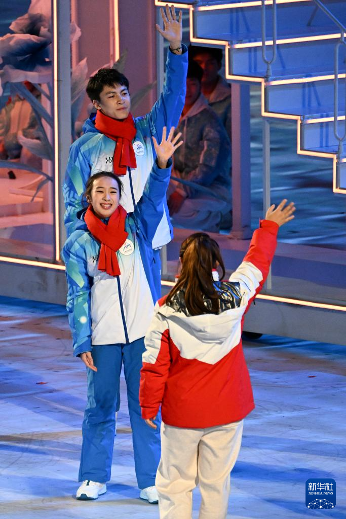 2月14日,吉祥物“濱濱”“妮妮”在閉幕式上。
