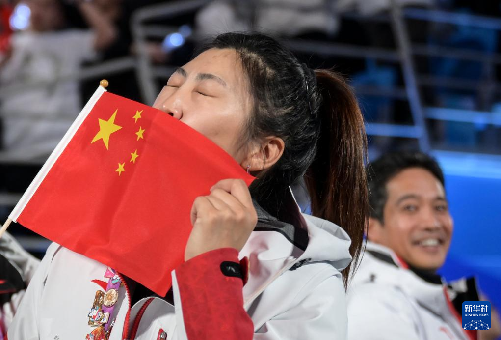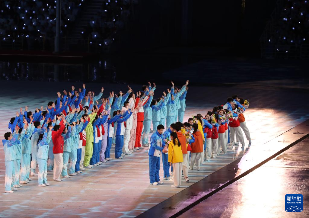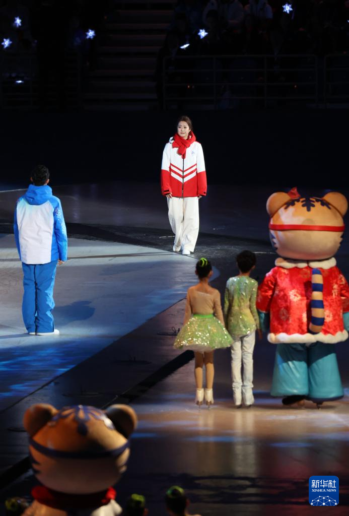 2月14日,中國體育代表團旗手徐夢桃(中)在閉幕式上。