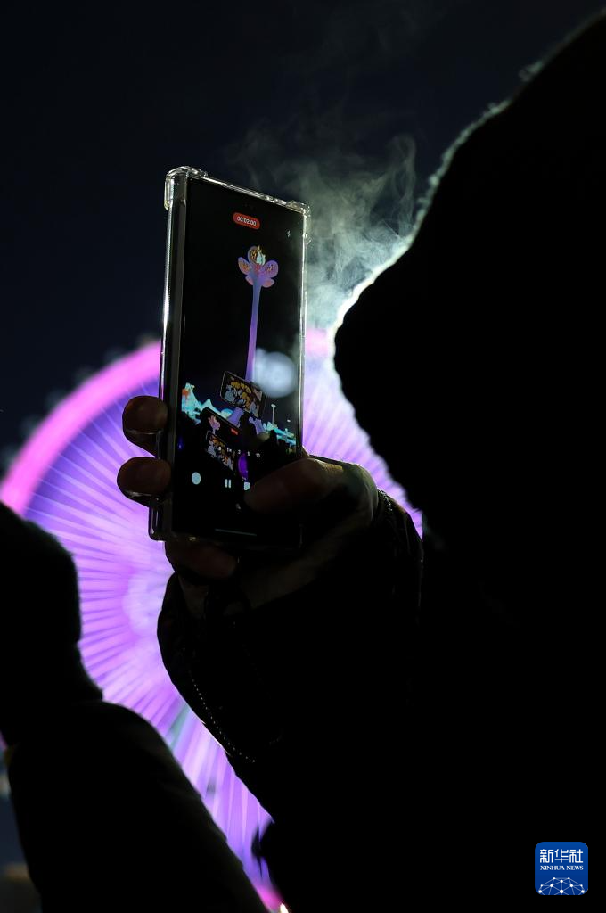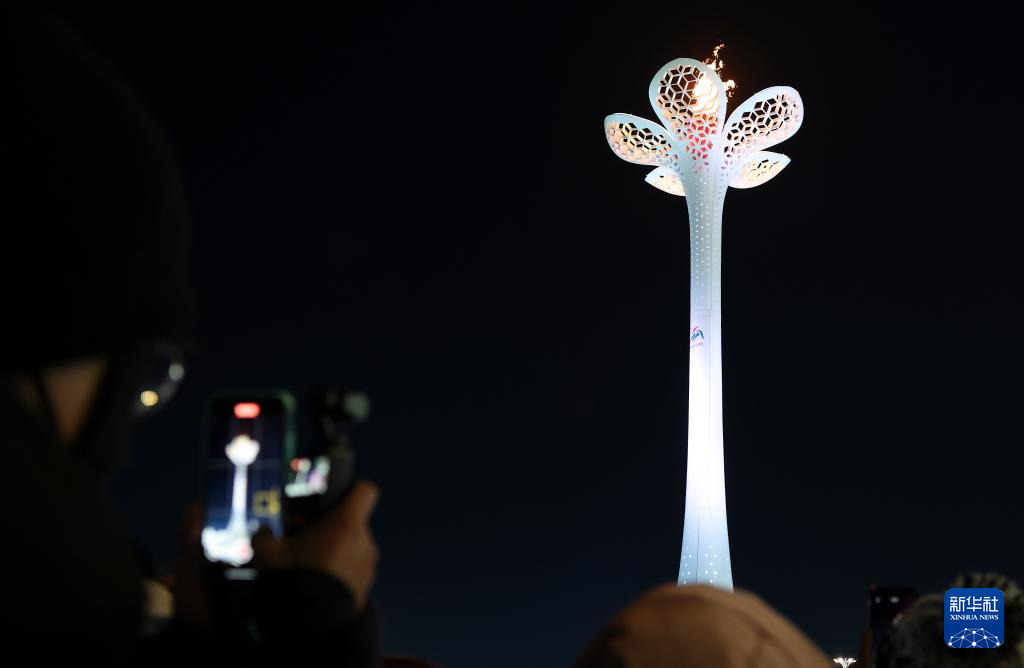 2月14日,觀眾在哈爾濱冰雪大世界拍攝亞冬會主火炬。