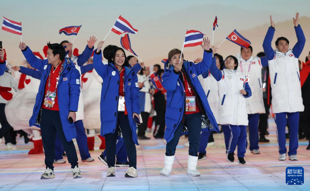 2月14日,泰國體育代表團成員(前)和朝鮮體育代表團成員在閉幕式上。