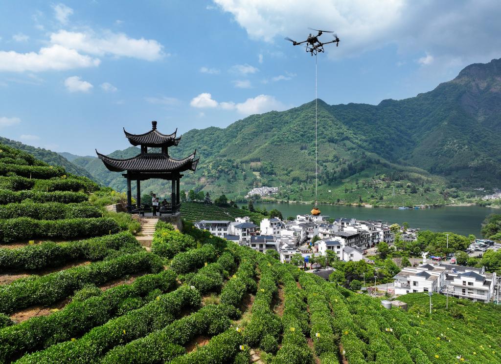 2024年4月27日,在安徽省黃山市黃山區新明鄉猴坑村,“90后”新農人項凡操作運載無人機在山區運送貨物(無人機照片)。新華社記者 杜宇 攝