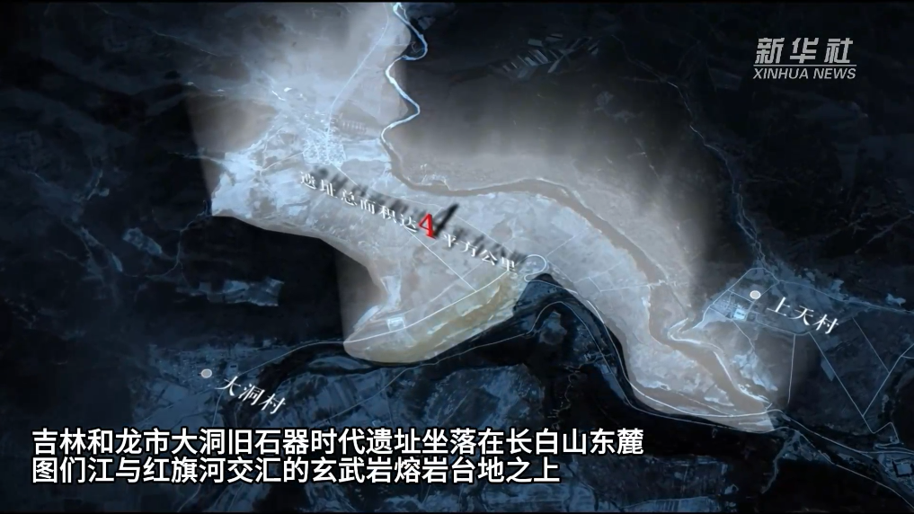 吉林和龍市大洞舊石器時代遺址坐落在長白山東麓,圖們江與紅旗河交匯的玄武巖熔巖臺地之上,分布范圍超過4平方公里,核心區面積約50萬平方米,是目前東北亞規模最大的舊石器時代晚期曠野遺址。