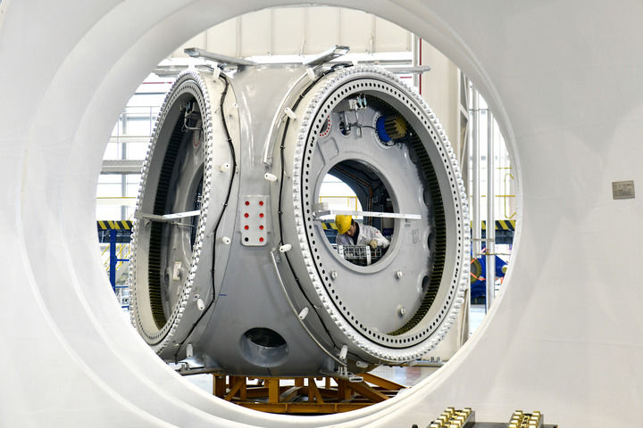 2025年2月22日,在三一重能(日照)風電設備制造有限公司,工作人員在風電設備生產車間忙碌。新華社記者 郭緒雷 攝