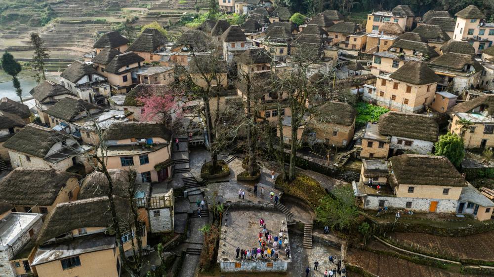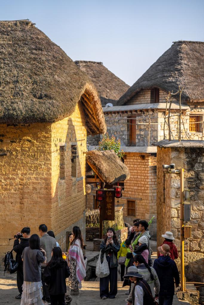2月28日,在云南省紅河哈尼族彝族自治州元陽縣阿者科村,正在村里游玩的游客們。新華社記者 胡超 攝