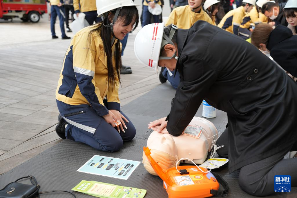 東京市中心六本木新城的廣場上,人們在工作人員指導下學習胸外按壓和除顫儀使用方法。廣場一側的帳篷內“濃煙”彌漫,人們聽從指揮,以濕巾捂住口鼻穿越帳篷。另一側,人們登上地震模擬車,體驗在地震的劇烈晃動中如何自救,還向消防員學習消防水槍的使用方法。