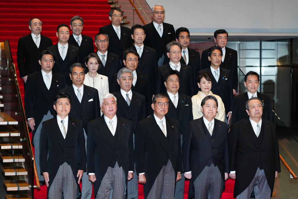 2024年11月11日,日本首相石破茂(前排中)經國會眾參兩院首相指名選舉當選日本第103任首相,隨即組建新內閣。圖為石破茂在日本東京的首相官邸率閣僚合影。新華社記者張笑宇攝