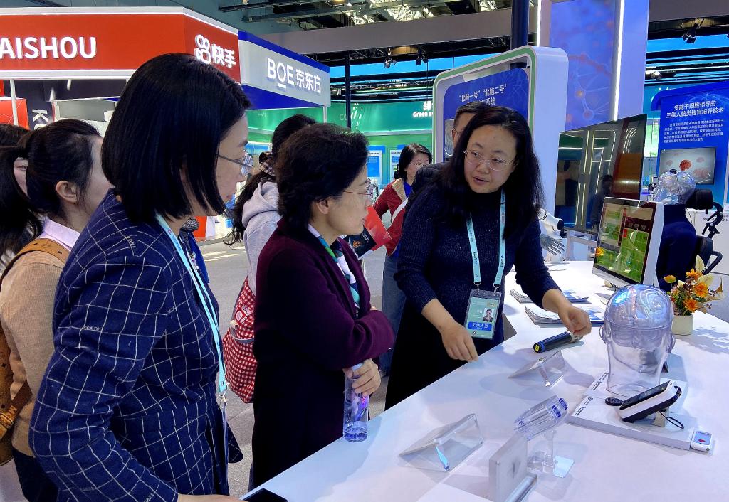3月29日,在2025中關村論壇年會上,北京芯智達神經技術有限公司業務發展總監李園(右)為往來嘉賓介紹公司腦機接口產品功能及臨床應用情況。新華社記者 魏夢佳 攝