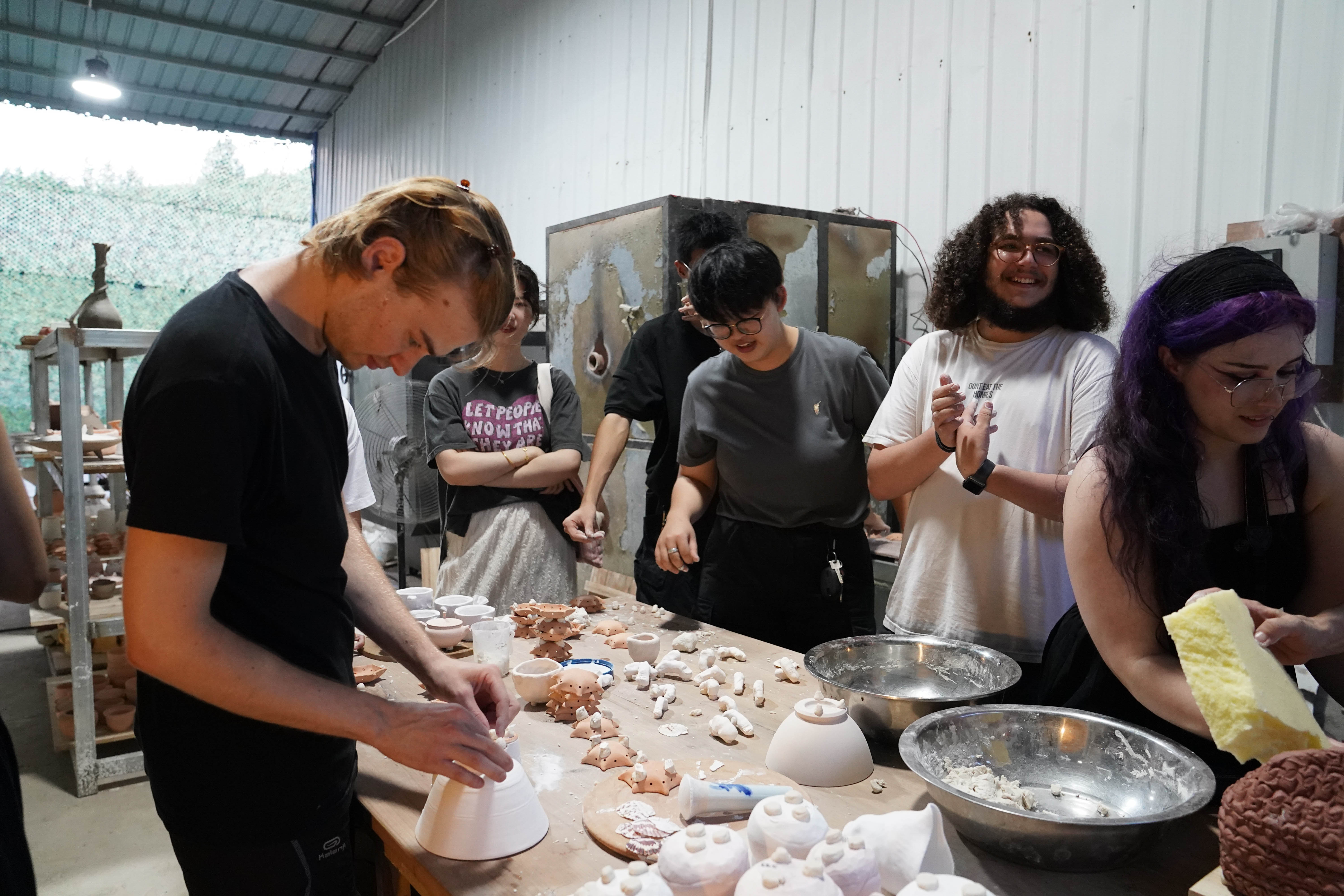 2024年7月17日,參觀者在江西景德鎮陶瓷大學的一處窯爐旁一起創作、討論。新華社記者 周密 攝