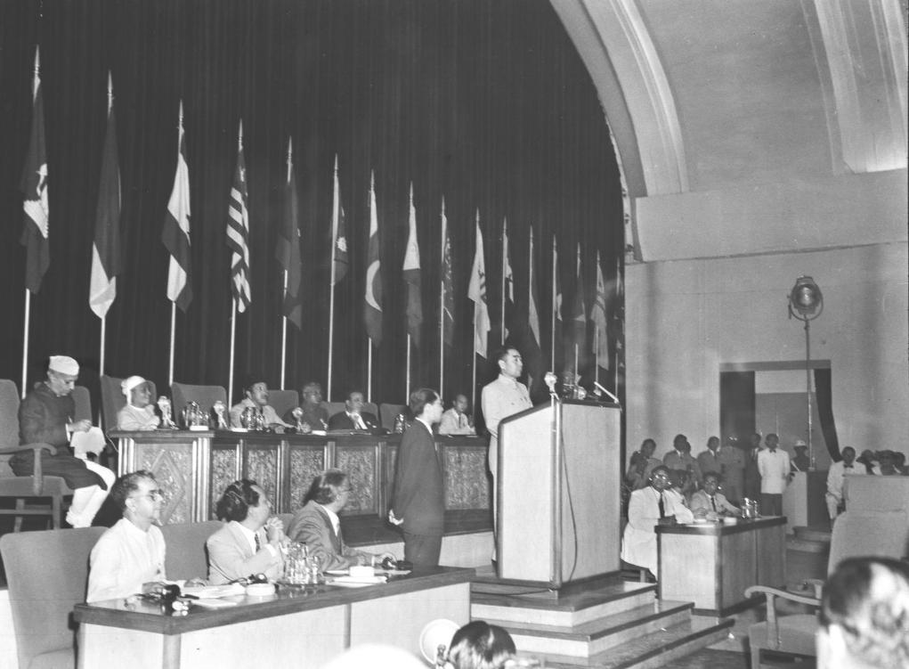 出席亞非會議的我國代表團首席代表周恩來總理1955年4月19日在亞非會議全體會議上作補充發言。新華社記者錢嗣杰攝