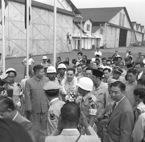 出席亞非會議的中華人民共和國代表團在中華人民共和國總理兼外交部長周恩來率領下,1955年4月17日乘飛機到達萬隆。印度尼西亞總理沙斯特羅阿米佐約(右戴深色帽者)到機場歡迎。新華社記者錢嗣杰攝