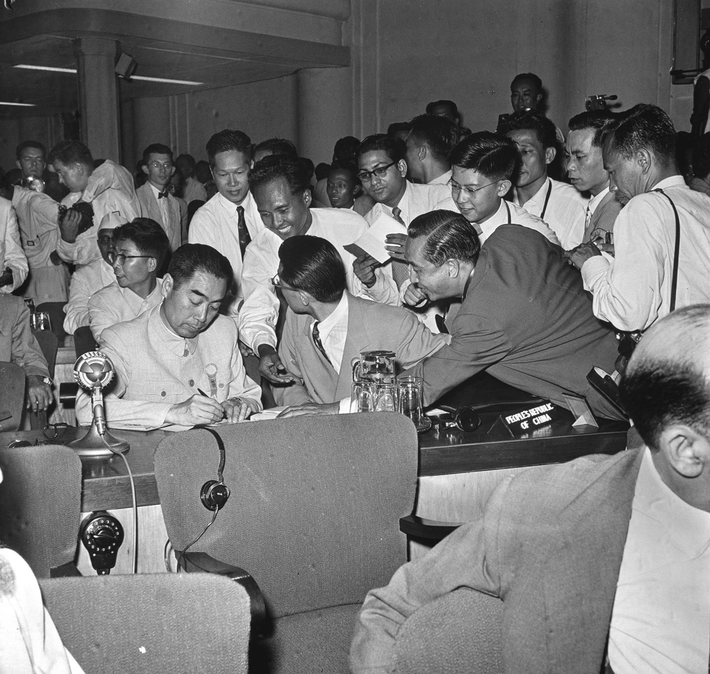 1955年4月18日至24日,周恩來總理率領我國代表團參加了在印尼萬隆市舉行的首屆亞非會議。在會議休息期間,各方人士請周恩來總理簽名留念。新華社記者錢嗣杰攝