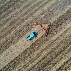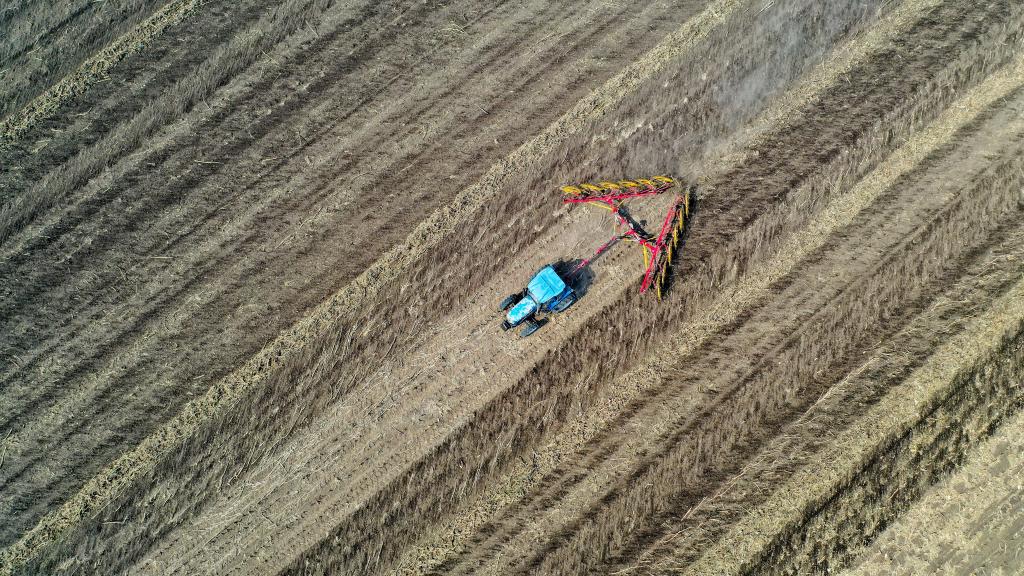 農民在吉林省公主嶺市范家屯鎮駕駛農機整理耕地里的秸稈(無人機照片)。新華社記者 張楠 攝