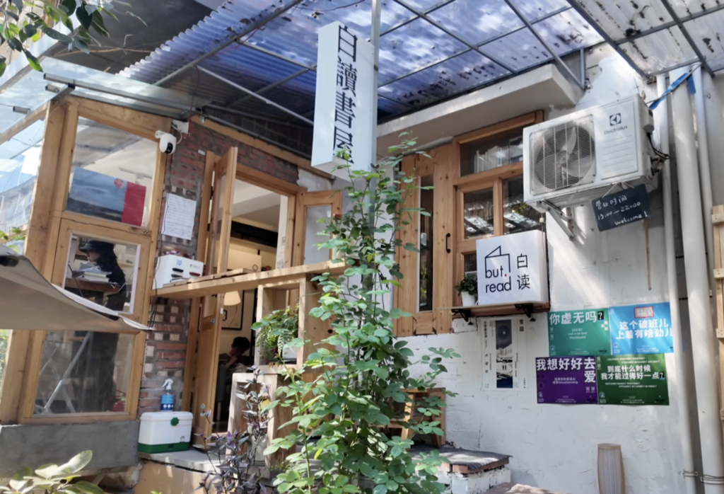 白讀書屋位于居民樓一層,招牌并不顯眼,如果步履匆匆,很容易擦肩而過。溫暖明亮的燈光點亮屋內,空間被書架隔斷成一個個隱秘的閱讀角。讀者或面對窗外綠植、或守著一盞落地燈、或蜷于榻榻米上的蒲團。