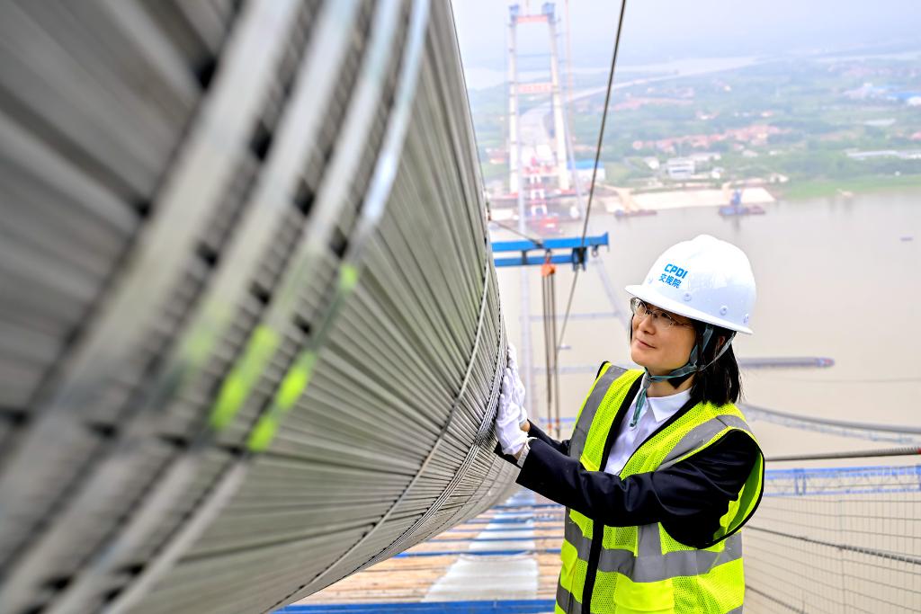 4月24日,在雙柳長江大橋建設現場,常英在貓道上查看主纜架設情況。(吳迪 攝)