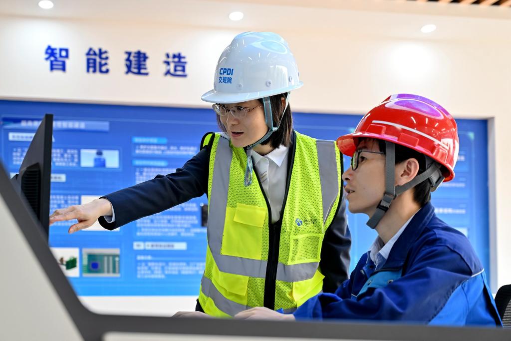 4月24日,在雙柳長江大橋建設現場,常英在中交二航局數智平臺上查看施工情況。(吳迪 攝)