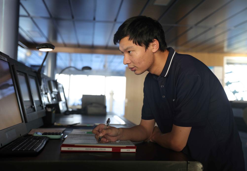 5月2日,“雪龍2”號實習三副李浩瑋在駕駛臺值班。新華社記者 黃韜銘 攝