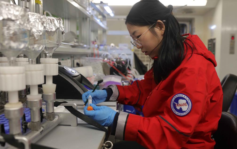 凌晨,考察隊員朱潔在“雪龍2”號船載實驗室工作。新華社記者 黃韜銘 攝