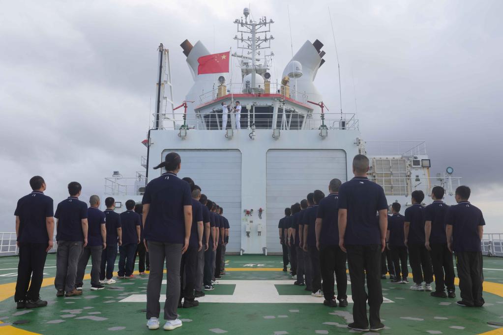 4日清晨,考察隊員們早早來到甲板集合。隨著雄渾國歌在海上奏響,隊員們面朝國旗,行注目禮。