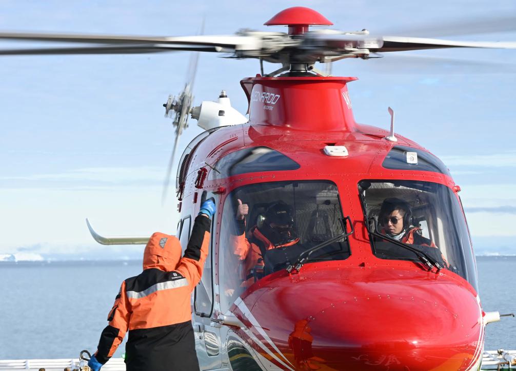 “雪龍2”號直升機機組在起飛前進行安全確認。新華社發(武佳星 攝)
