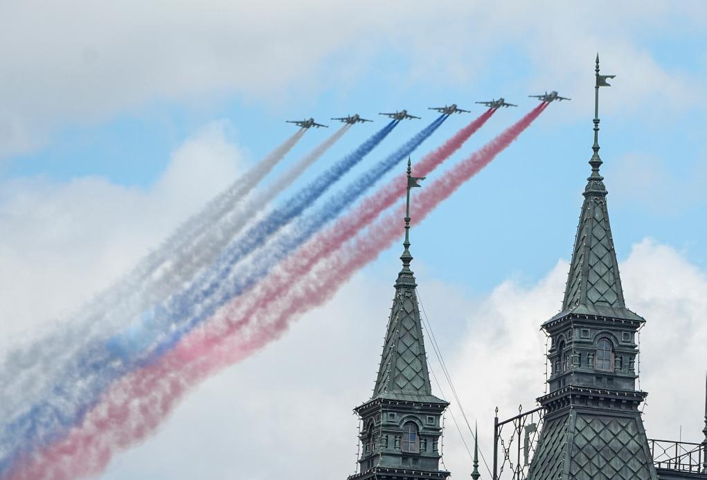 5月9日,在俄羅斯首都莫斯科,參加紀念蘇聯偉大衛國戰爭勝利80周年閱兵式的戰機編隊拉煙飛行。新華社記者 賴向東 攝