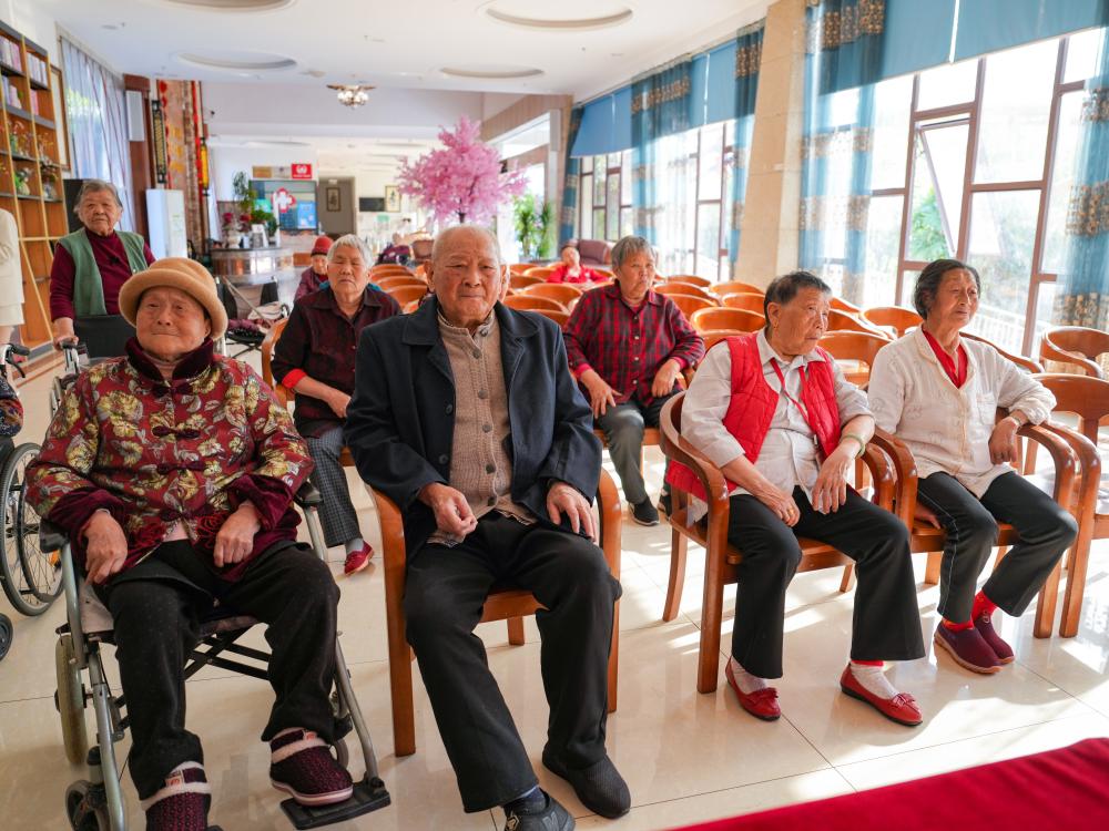 ↑在四川省南充市五福堂頤養院,劉壽山(前排左二)與老人們一起看電視(4月9日攝)。