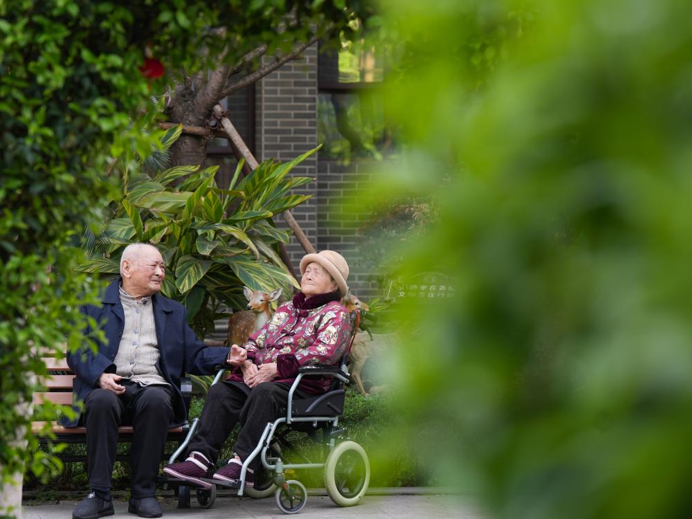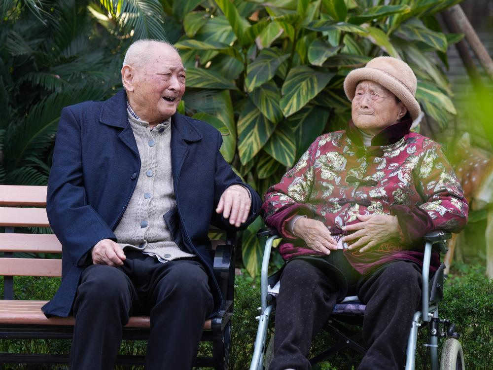 ↑劉壽山(左)和妻子楊宗菊在四川省南充市五福堂頤養院聊天(4月9日攝)。