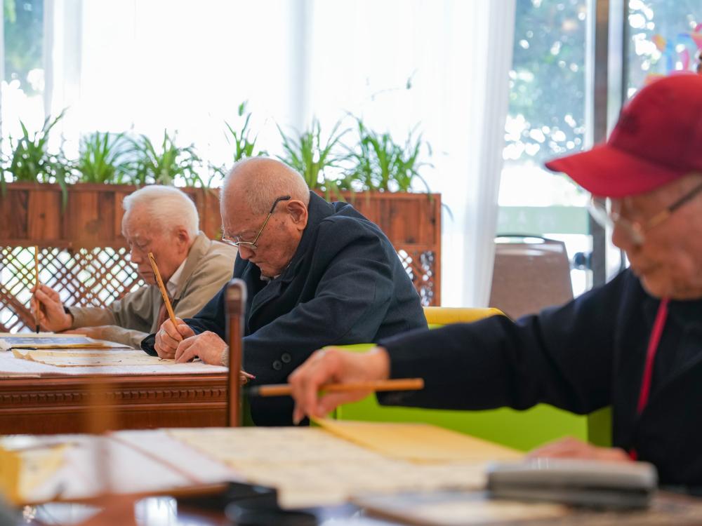 ↑劉壽山(中)在四川省南充市五福堂頤養院練習書法(4月9日攝)。