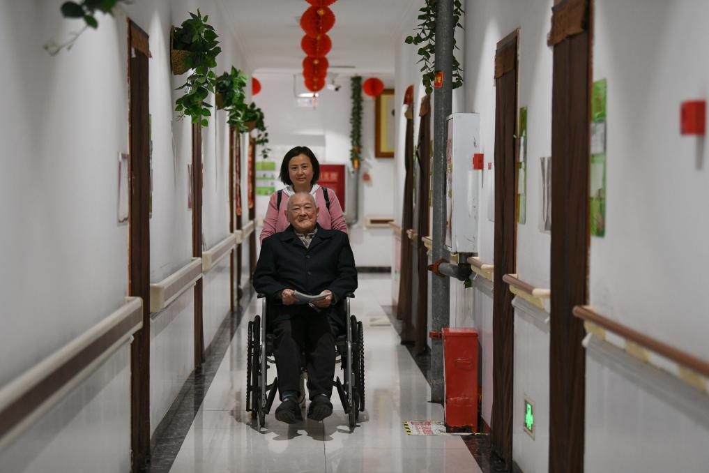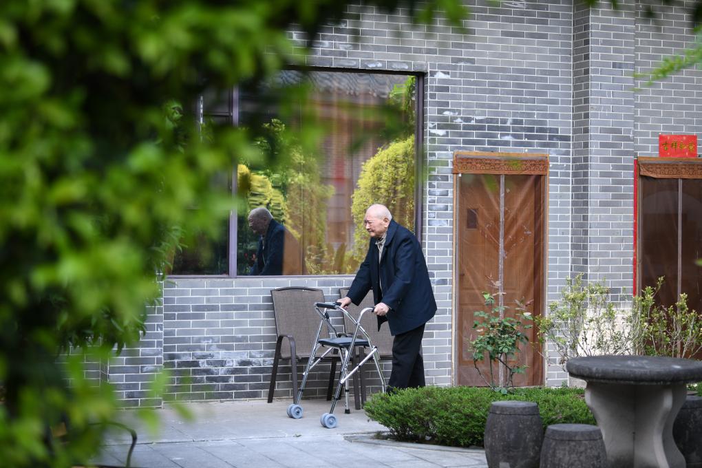 ↑劉壽山在四川省南充市五福堂頤養院散步(4月9日攝)。