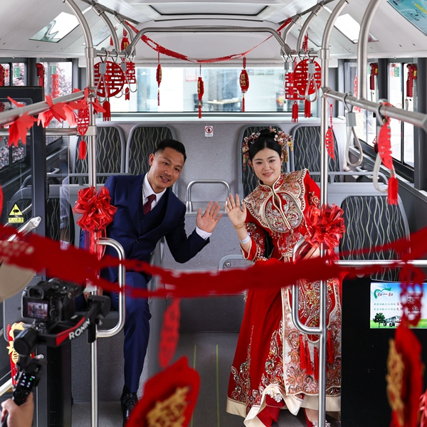 2025年4月30日,“愛情巴士”搭載著新郎新娘前往浙江諸暨市同山鎮唐仁村祠堂進行婚禮儀式。新華社記者 江漢 攝