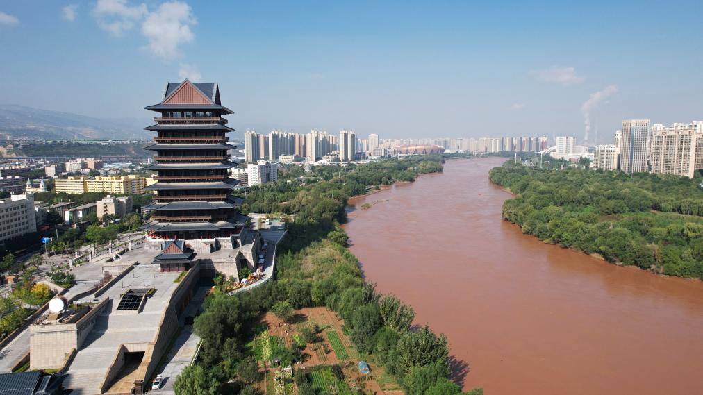 ↑位于黃河蘭州段南岸的黃河樓。新華社記者陳斌攝