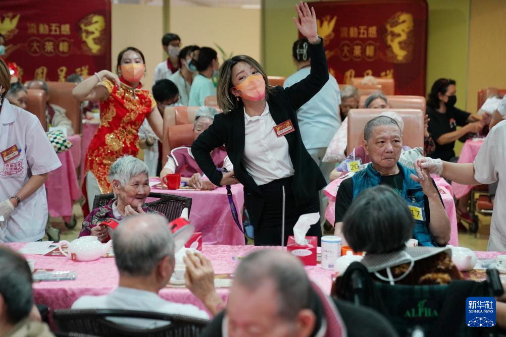 5月24日,在香港松悅園耆和護養院,香港樂齡社企“軟餐俠”的職員們扮演成“茶樓”經理、廚師和接待員,為老人家提供沉浸式茶樓就餐體驗。新華社發(王申 攝)