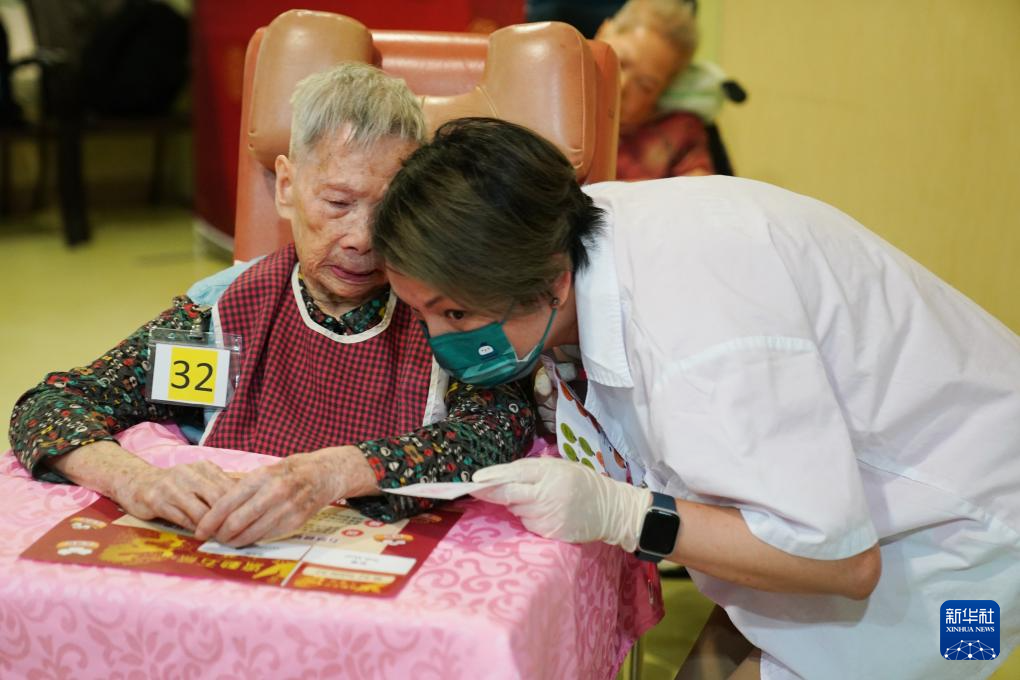 5月24日,在香港松悅園耆和護養院,老人們在餐后得到暖心拍立得照片和祝??ㄆ?。新華社發(王申 攝)