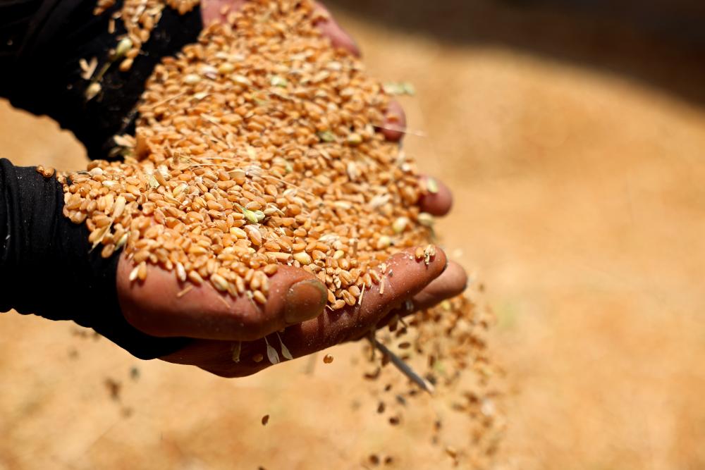 5月25日,在山東省棗莊市市中區稅郭鎮沙溝村麥田,農民展示剛剛收獲的小麥。新華社發(孫中喆攝)