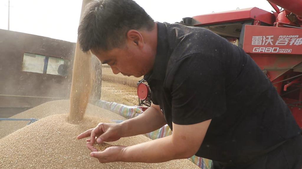 河南省商丘市李莊鎮潘堂村種糧大戶閆照峰在查看新收獲的小麥。新華社記者 姜亮 攝