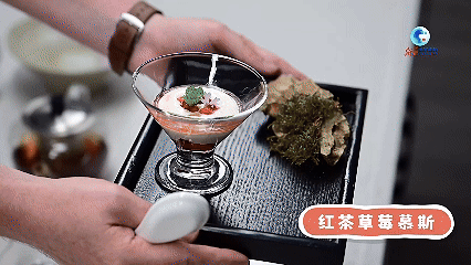 這片葉子的變身遠不止于此,在一家茶藝職業培訓學校,科特領略了茶葉和辣椒、谷物、水果、酒釀等各色食材碰撞后的百變新生。這些創意十足的新中式調飲令他大開眼界,他也分享制作了一道頗具西方特色的紅茶草莓慕斯。