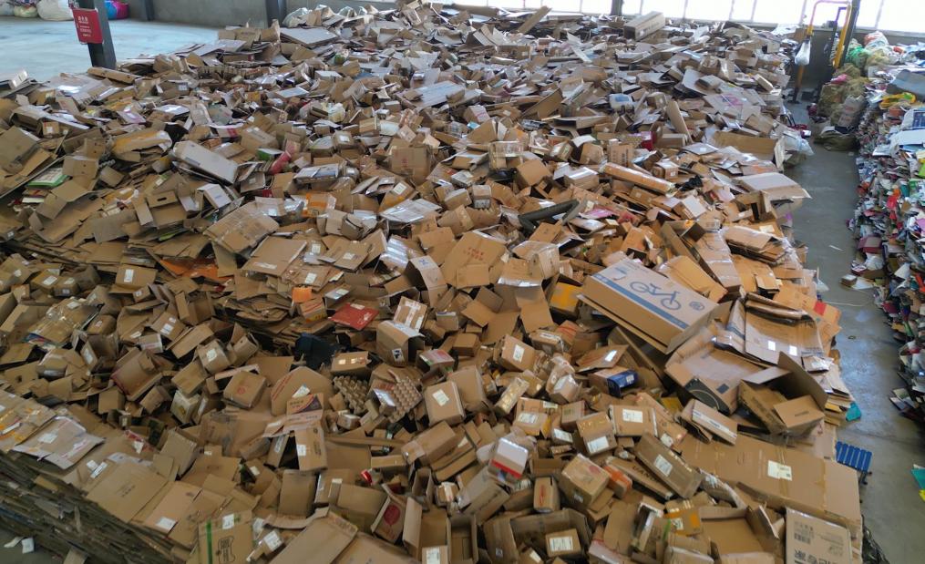 一家垃圾回收企業的分揀中心內堆滿了廢棄的快遞包裝紙。新華社記者 司曉帥攝