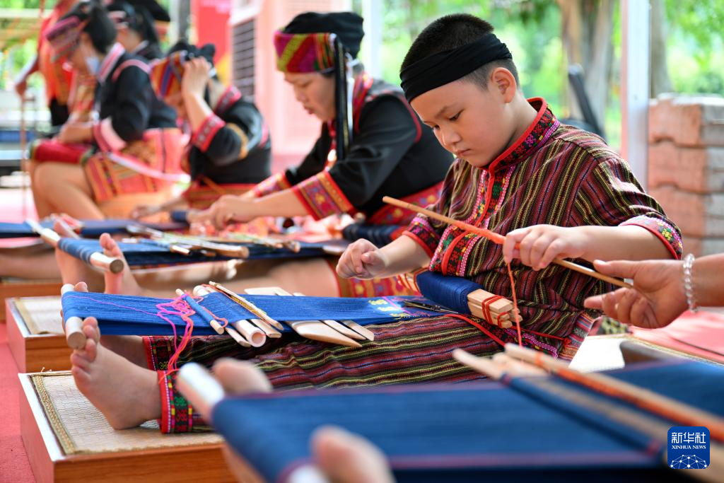 2022年6月11日,一名來自五指山市的黎族小朋友在三亞南山非遺節展示黎族織錦技藝。新華社記者 郭程 攝