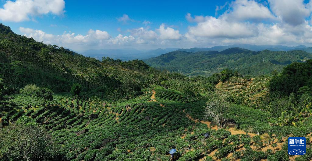 2025年6月8日,工人在位于海南五指山市與保亭黎族苗族自治縣交界處的海南農墾金鼎茶園采茶(無人機照片)。新華社記者 郭程 攝