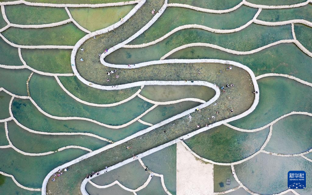 2025年6月7日,市民和游客在五指山市小島公園魚鱗壩游玩(無人機照片)。新華社記者 郭程 攝