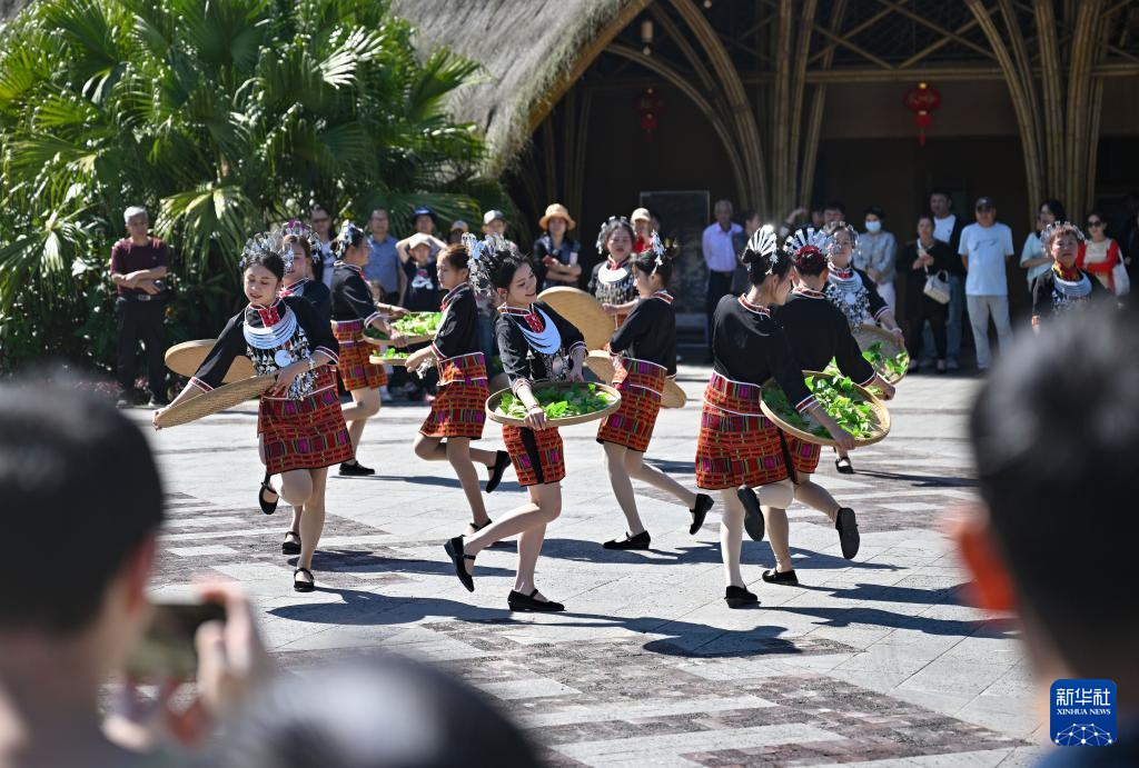 2024年2月14日,五指山市水滿鄉毛納村歌舞隊為游客表演黎族舞蹈。新華社記者 郭程 攝