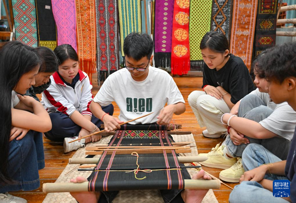 2025年6月10日,在位于五指山市的海南省民族技工學校,老師(中)教學生黎族織錦。新華社記者 郭程 攝