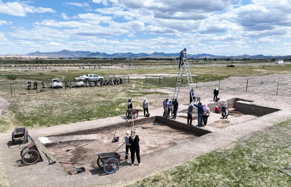 考古人員在遼上京遺址進行發掘(無人機照片)。新華社記者彭源攝