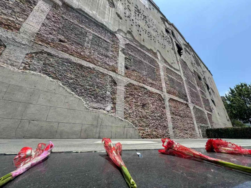↑上海四行倉庫西墻下,參觀者為曾在此堅守的“八百壯士”奉上鮮花。新華社記者狄春攝