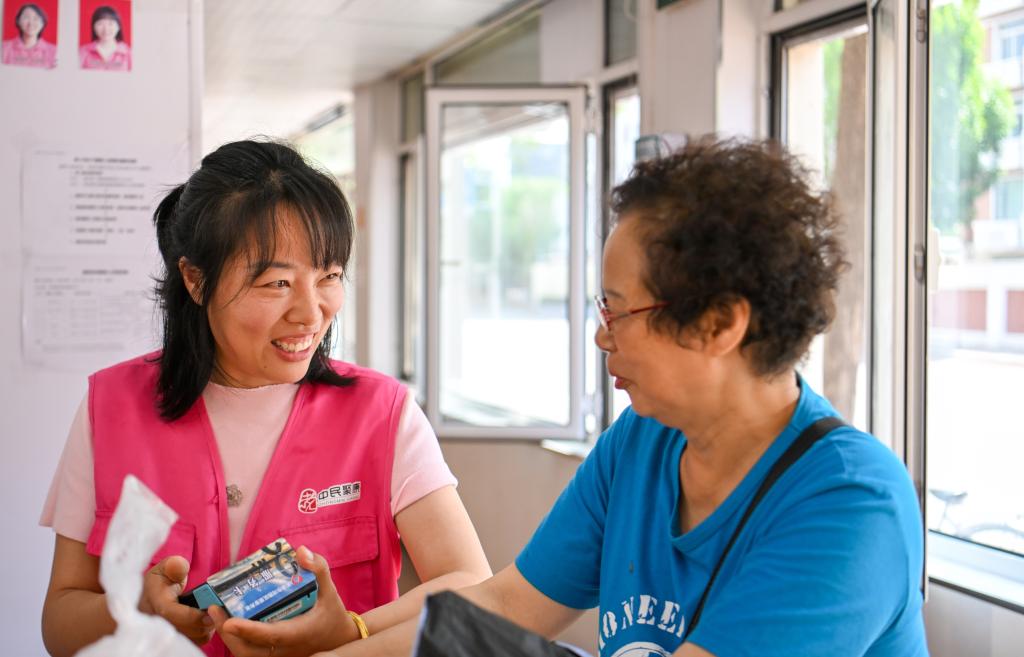 在天津市河西區賓西樓居家養老服務中心,劉緩緩(左)為老人辦理業務時與老人聊家常。新華社記者 孫凡越 攝