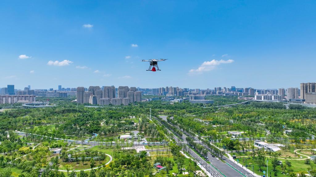 2024年7月5日,無人機在合肥駱崗公園配送外賣。新華社發(羅浩宇攝)