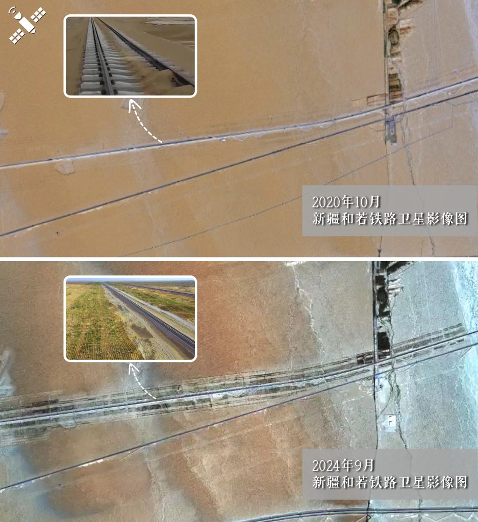 解讀:2020年黃沙漫道與2024年綠帶護路對比:和若鐵路沿線成功筑牢生態屏障。
