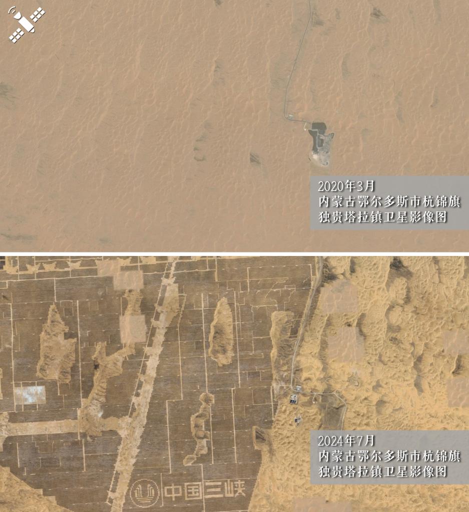 解讀:2020年沙丘裸露的荒漠(上圖)與2024年光伏治沙工程竣工后的同一區域(下圖)對比,荒漠已變生態屏障。