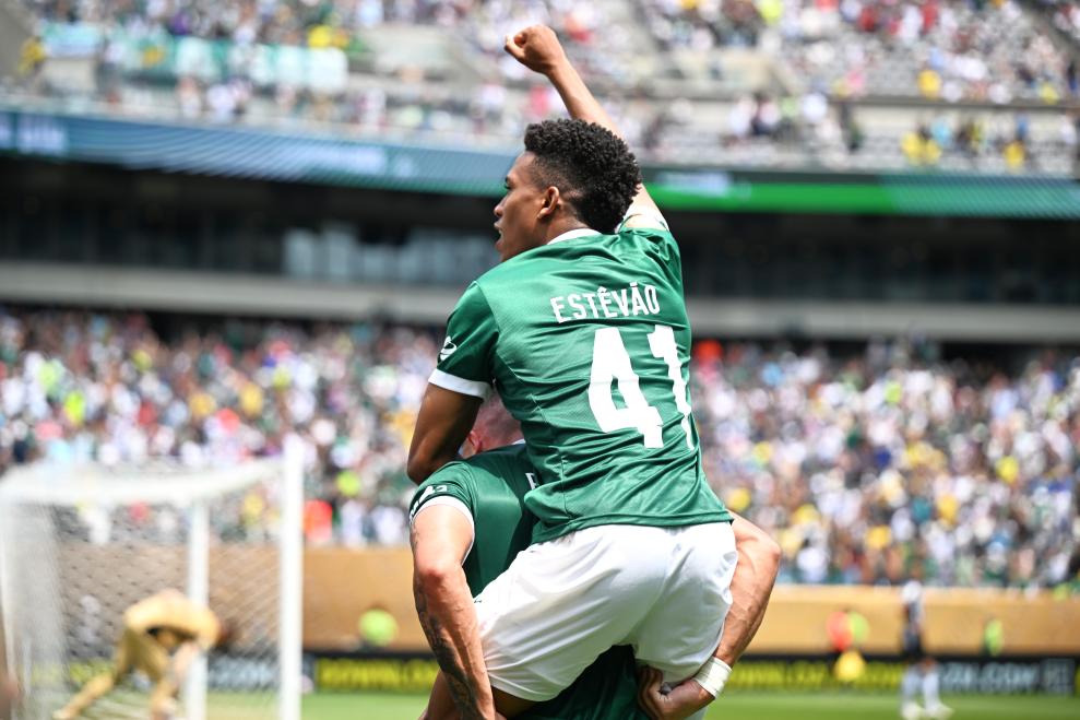 6月28日,帕爾梅拉斯隊球員保利尼奧(下)破門得分后與隊友埃斯特旺慶祝