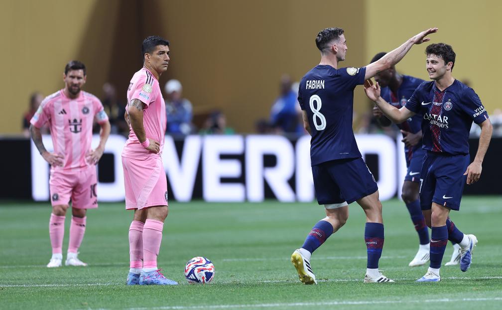 6月29日,巴黎圣日耳曼隊球員內維斯(右)打入個人第二粒進球后與隊友慶祝