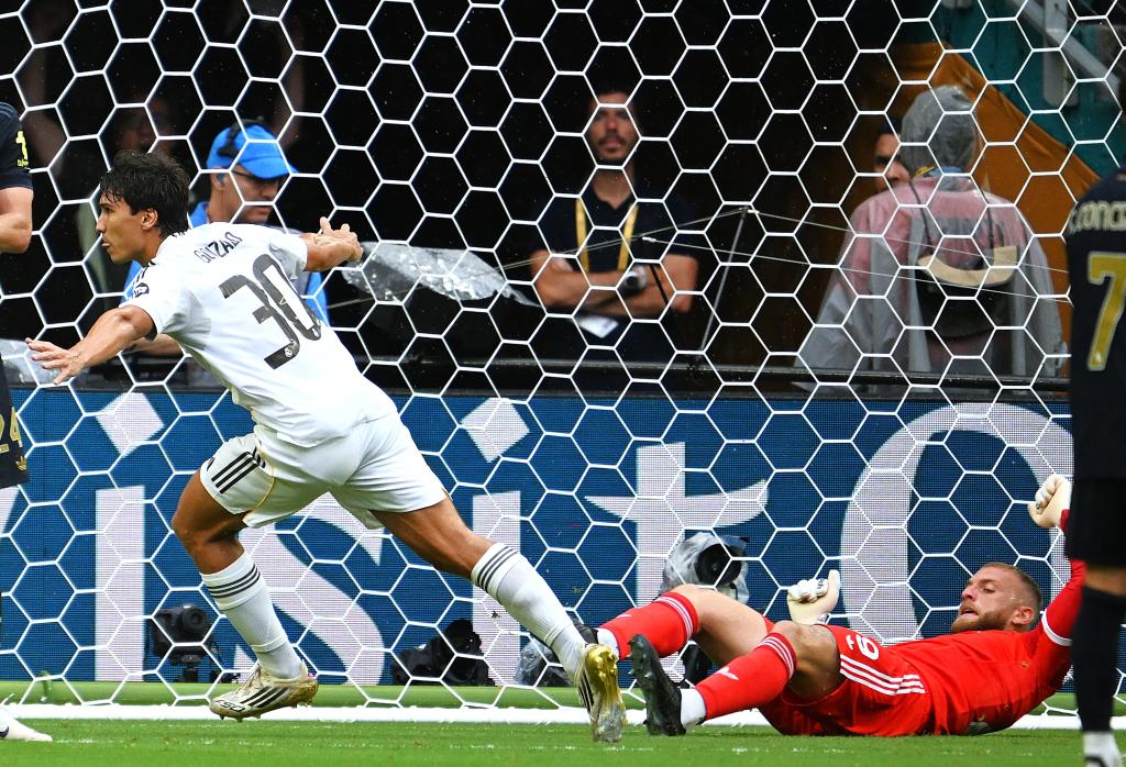 7月1日,皇家馬德里隊球員貢薩洛·加西亞(左)在頭球破門后慶祝